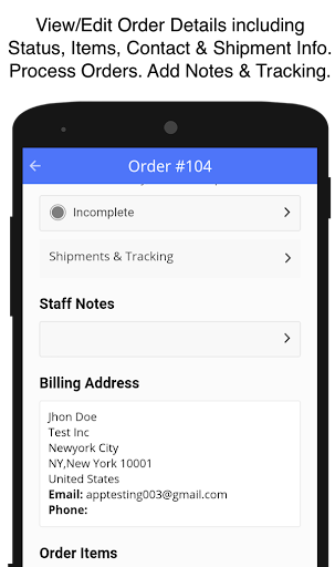 Orders: View list of orders (latest first) or drill down into specific order to view value, stuff ordered, billing & shipping address, staff notes, customer comments and full info of the customer. You can filter orders by status, search any order by ID, change status of any particular order or add staff notes. Additionally, you can view/add shipment & tracking information for any order. Abandoned carts are also available as 'Incomplete Orders'. Staff notes can be added through the app. (In-app product: $0.99/month subscription)